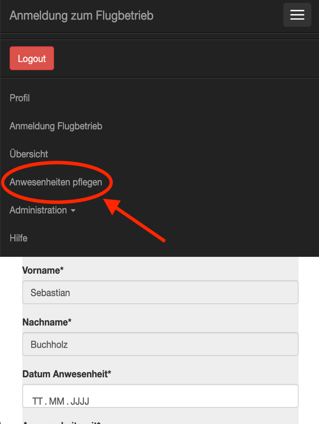 Alle Flugleiter, Fluglehrer und Vorstandsmitglieder haben in der linken Navigationsleiste eine weitere Auswahlmöglichkeit: Anwesenheiten pflegen (s. Abbildung 9)